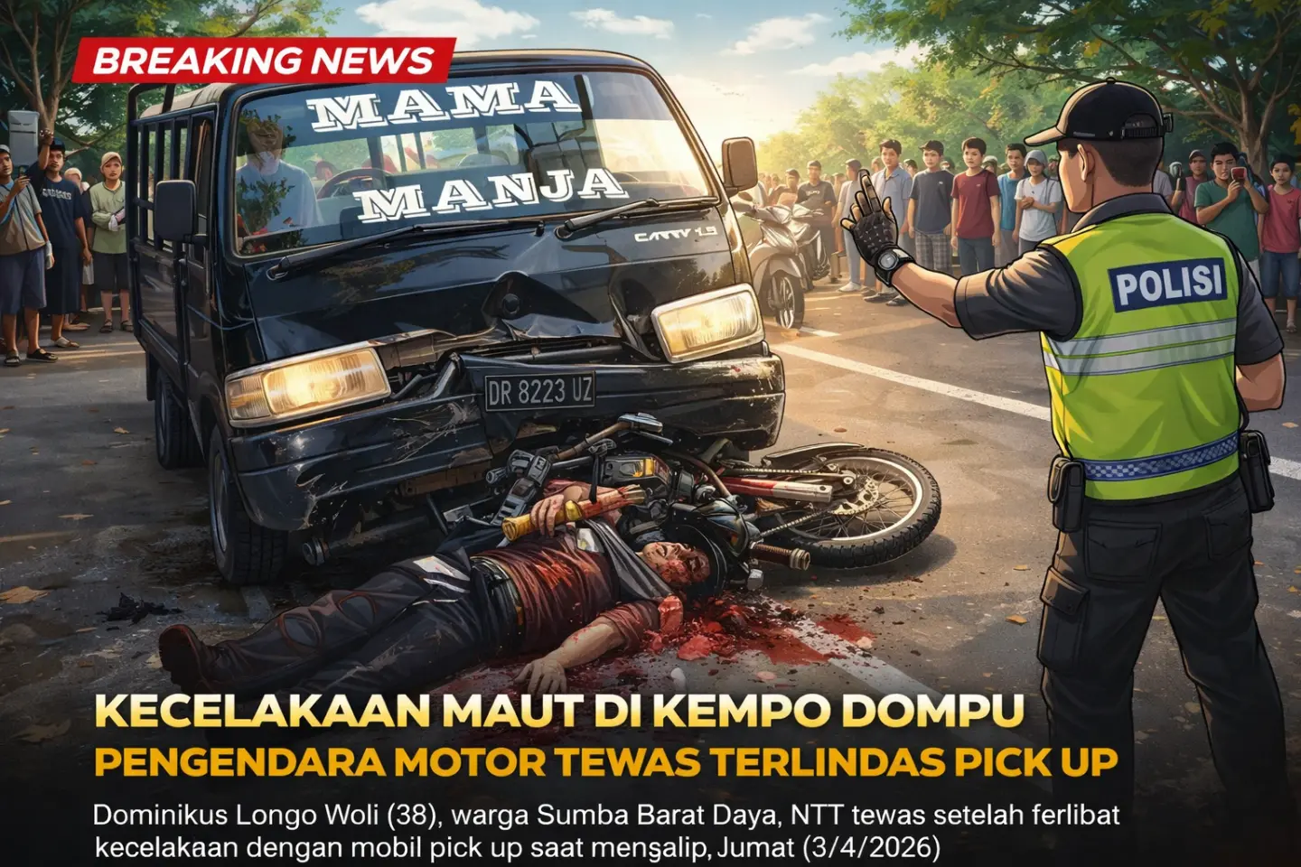 Sementara itu, pengemudi mobil pick up diketahui berinisil A (41), warga Dusun Saleko, Desa Ta’a, Kecamatan Kempo, Kabupaten Dompu.